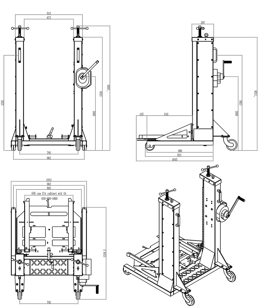 2.1 移動(dòng)式升降轉運車(chē)采用提升牽引自鎖帶剎車(chē)式手搖絞盤(pán),安全、可靠、省力。提升最大重量500KG。鋼繩直徑不小于5mm,采用實(shí)心鍍鋅鋼繩,高強度承重,高強拉斷力。