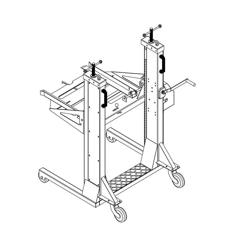 移動(dòng)式升降轉運車(chē)整體形式采用類(lèi)龍門(mén)式左右支撐,適用于全電流等級真空斷路器。轉運車(chē)的升降采用手搖絞盤(pán)旋轉鋼絲繩,驅動(dòng)前置托盤(pán)上下移動(dòng),為防止托盤(pán)脫落還有安全聯(lián)鎖裝置。前置托盤(pán)按照斷路器底盤(pán)車(chē)輔助開(kāi)關(guān)位置開(kāi)孔,可在轉運車(chē)上進(jìn)行維修。整體轉運車(chē)采用萬(wàn)向輪移動(dòng)靈活且具有剎車(chē)功能,可防止轉運車(chē)不穩溜車(chē)。